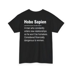 $11.58 – $16.15Price range: $11.58 through $16.15Our original "Hobo Sapien" Unisex Heavy Cotton T-shirt is sure to please and the basic staple of any wardrobe. It is the foundation upon which casual fashion grows. The specially spun fibers provide a smooth surface for premium printing vividity and sharpness. No side seams mean there are no itchy...Select options This product has multiple variants. The options may be chosen on the product page