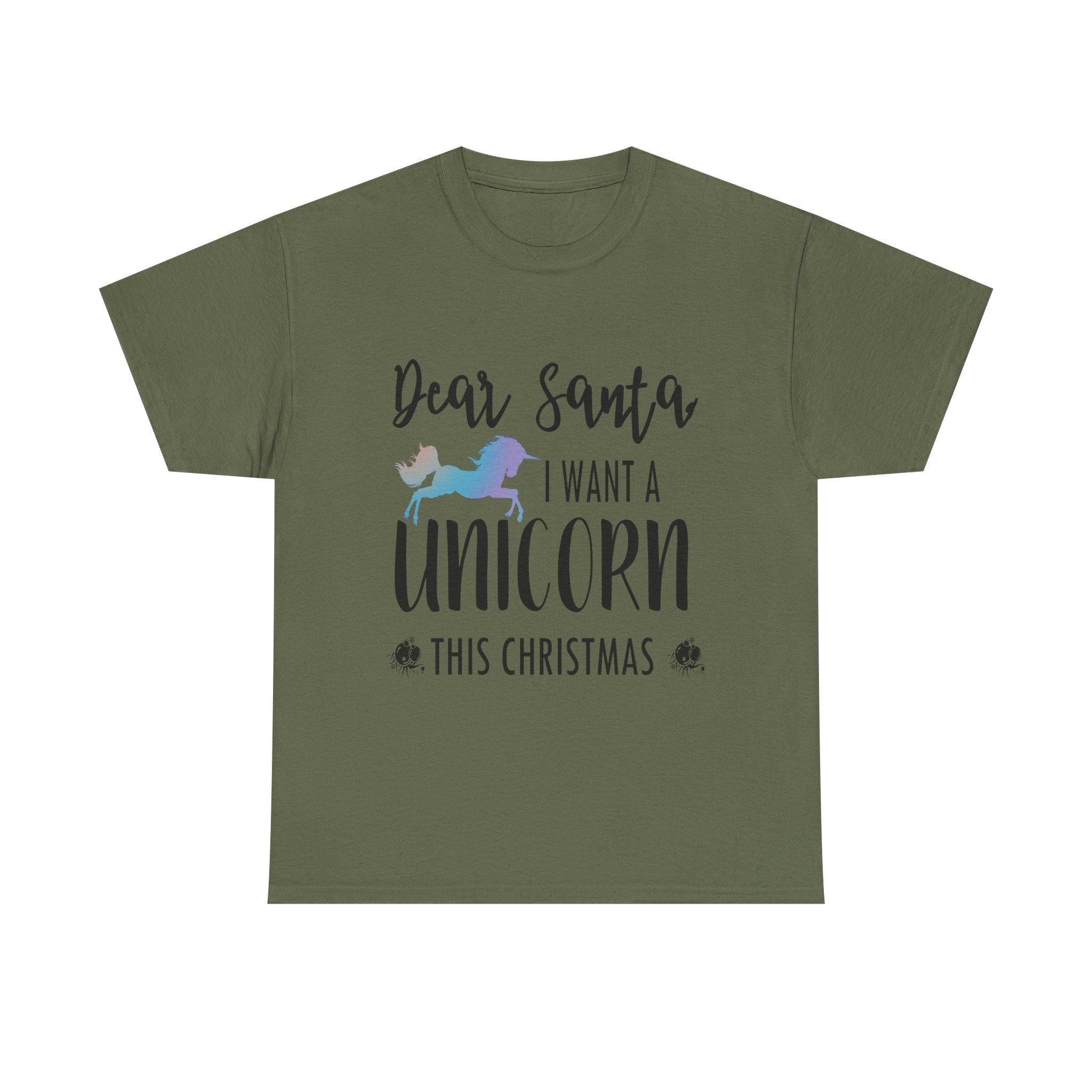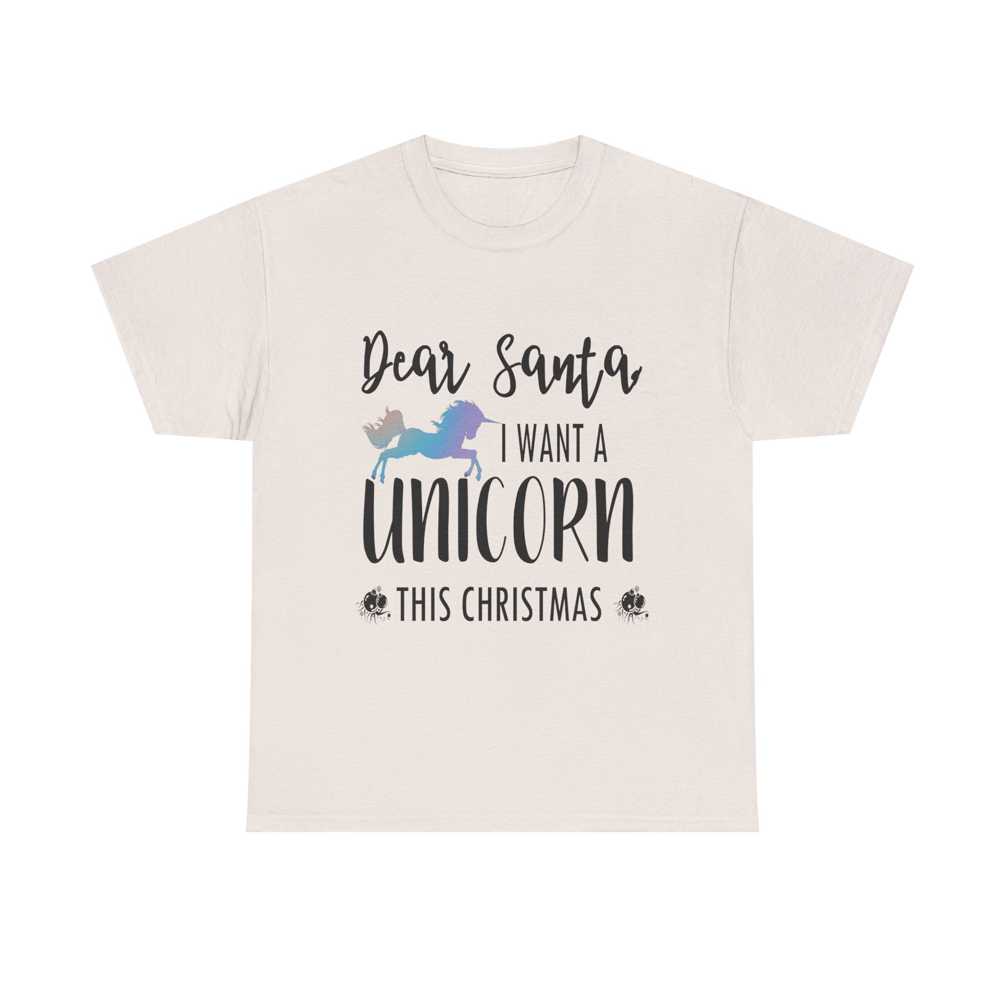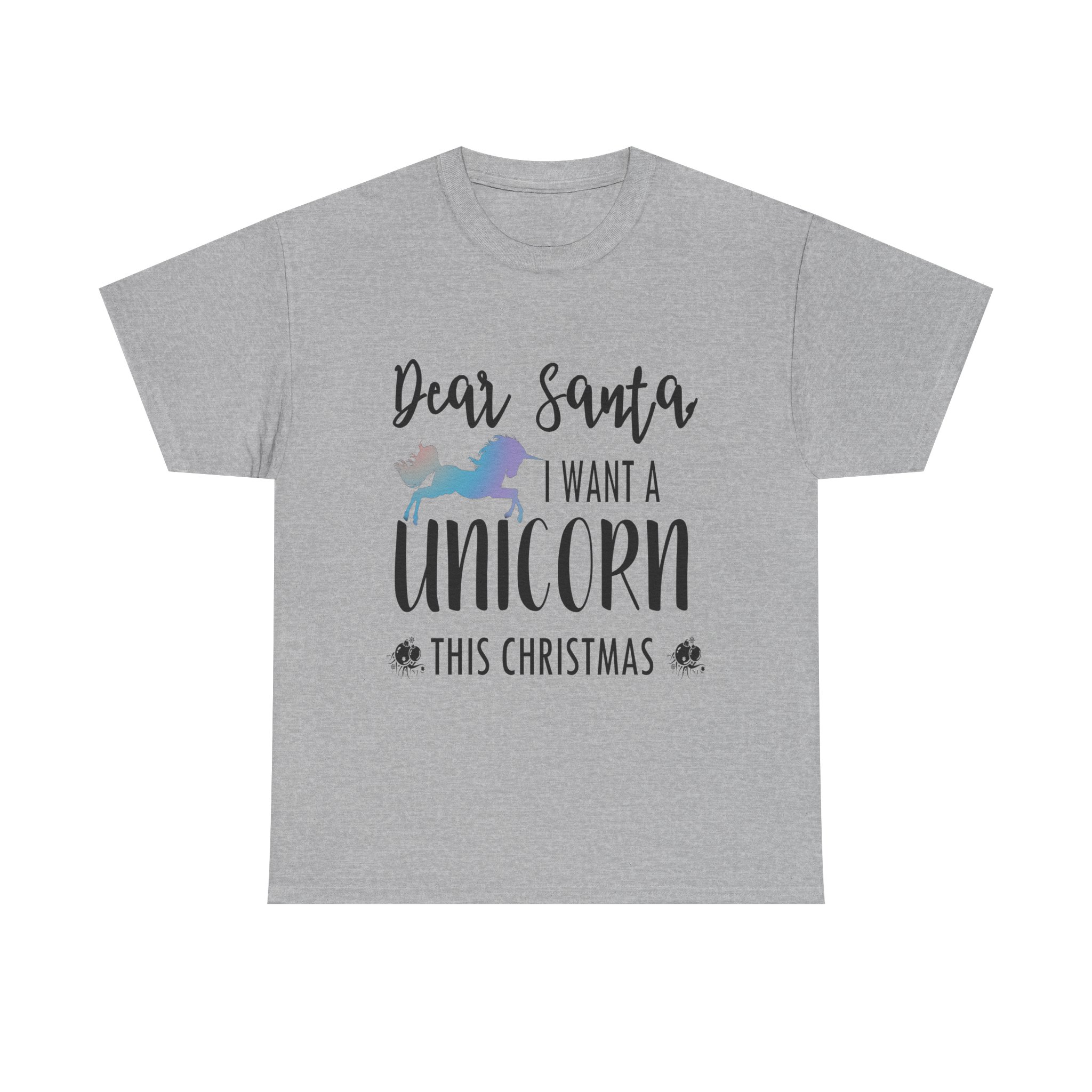 - The tear-away label means a scratch-free experience with no irritation or discomfort whatsoever. Our “Dear Santa I want A Unicorn This Christmas Unisex Heavy Cotton T-shirt” offers exactly that comfort.