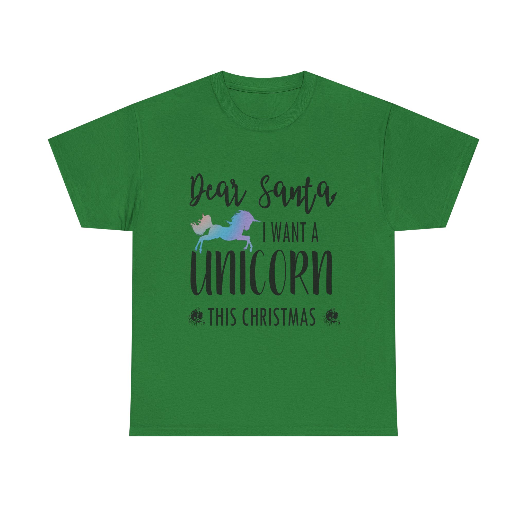 - The classic fit of this “Dear Santa I want A Unicorn This Christmas Unisex Heavy Cotton T-shirt” ensures a comfy, relaxed wear while the crew neckline adds that neat, timeless look that can blend into any occasion, casual or semi-formal.