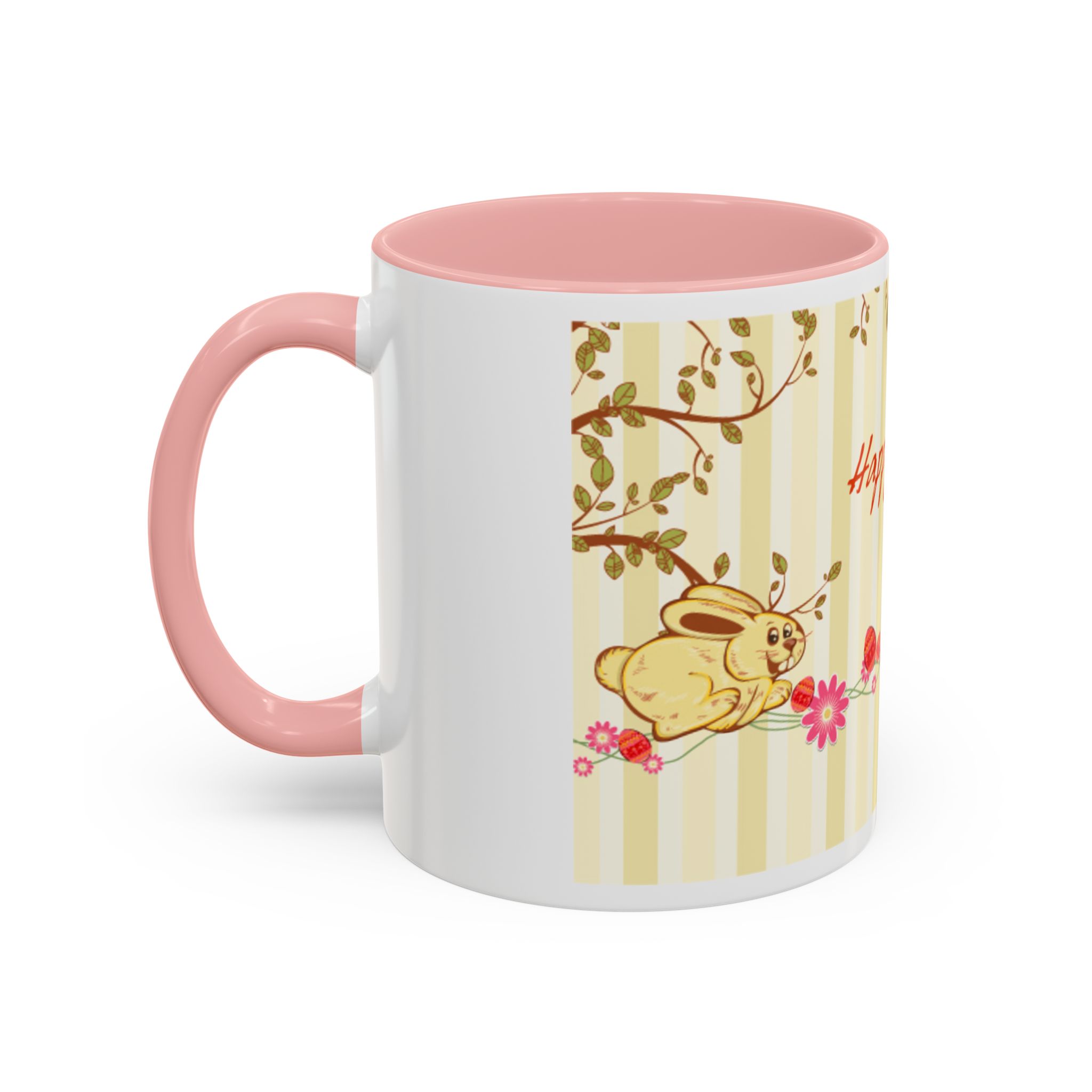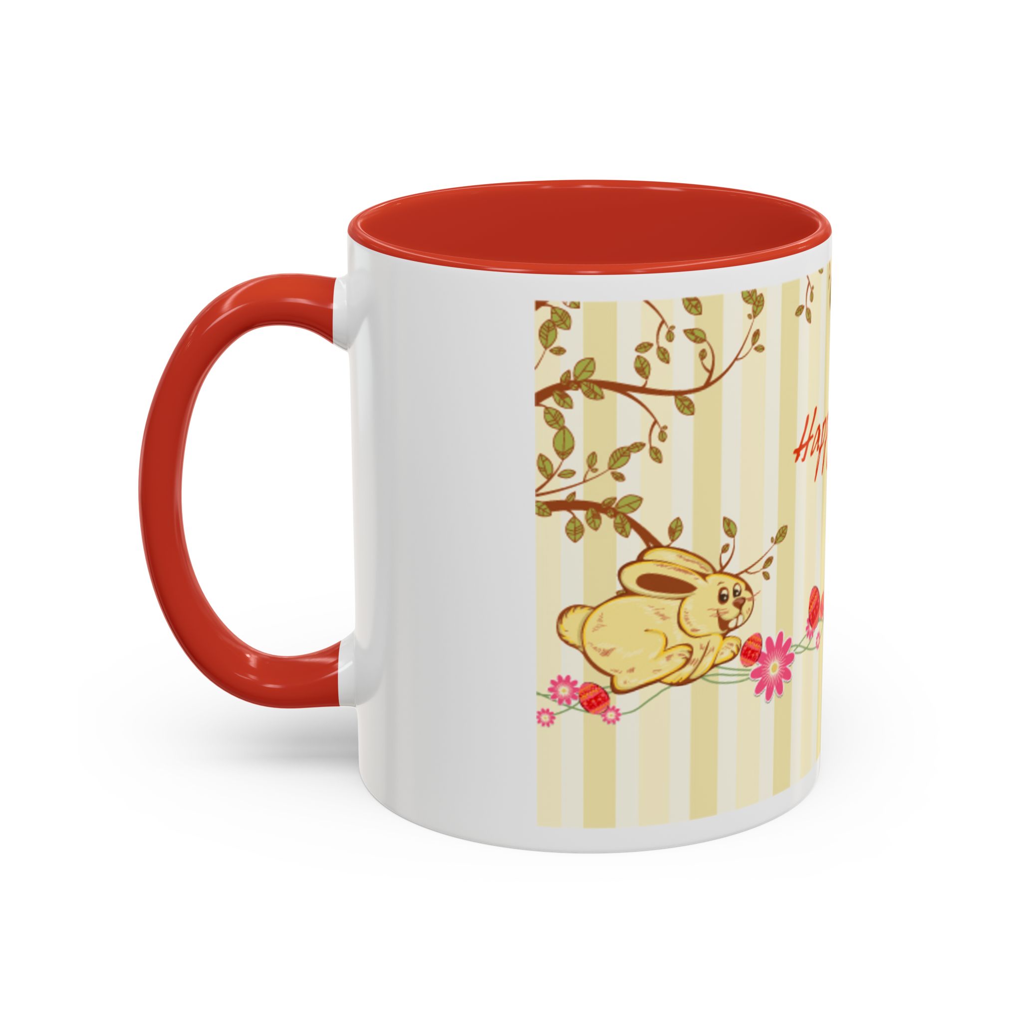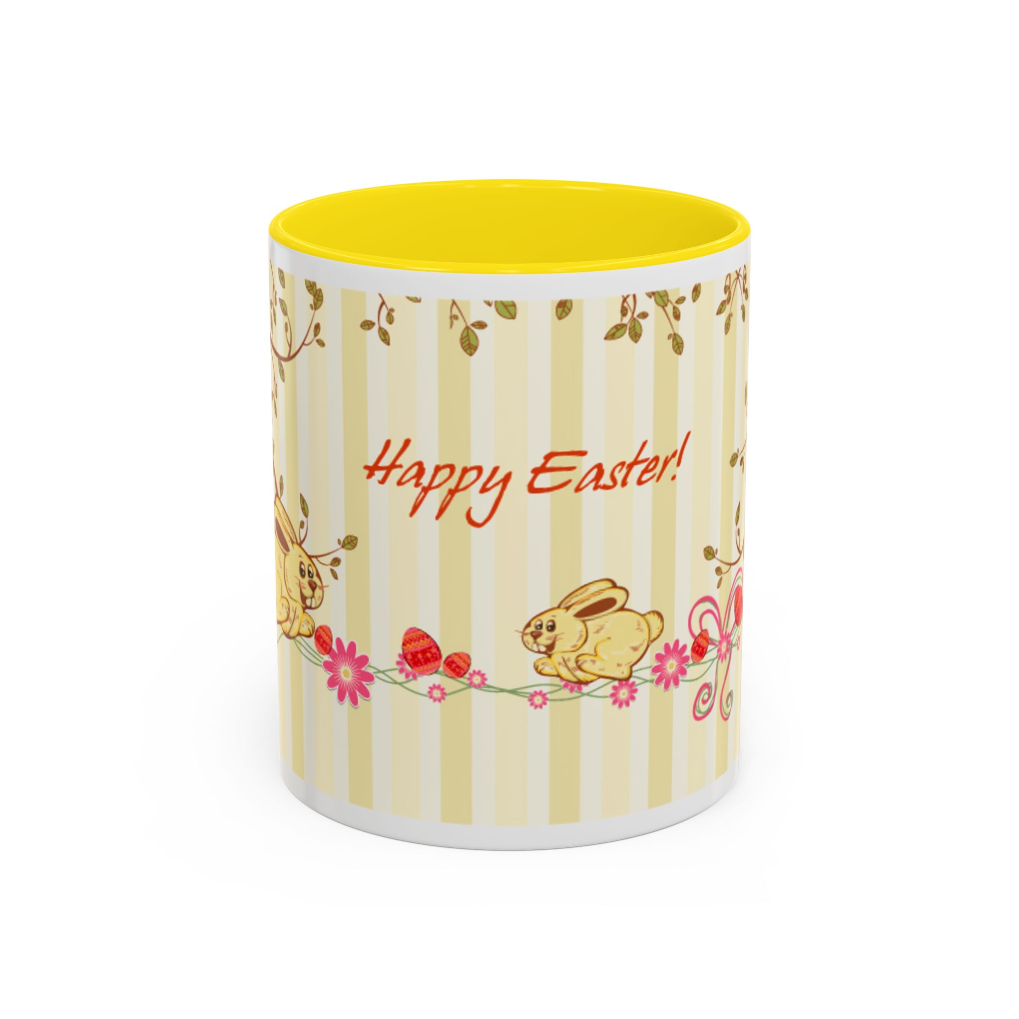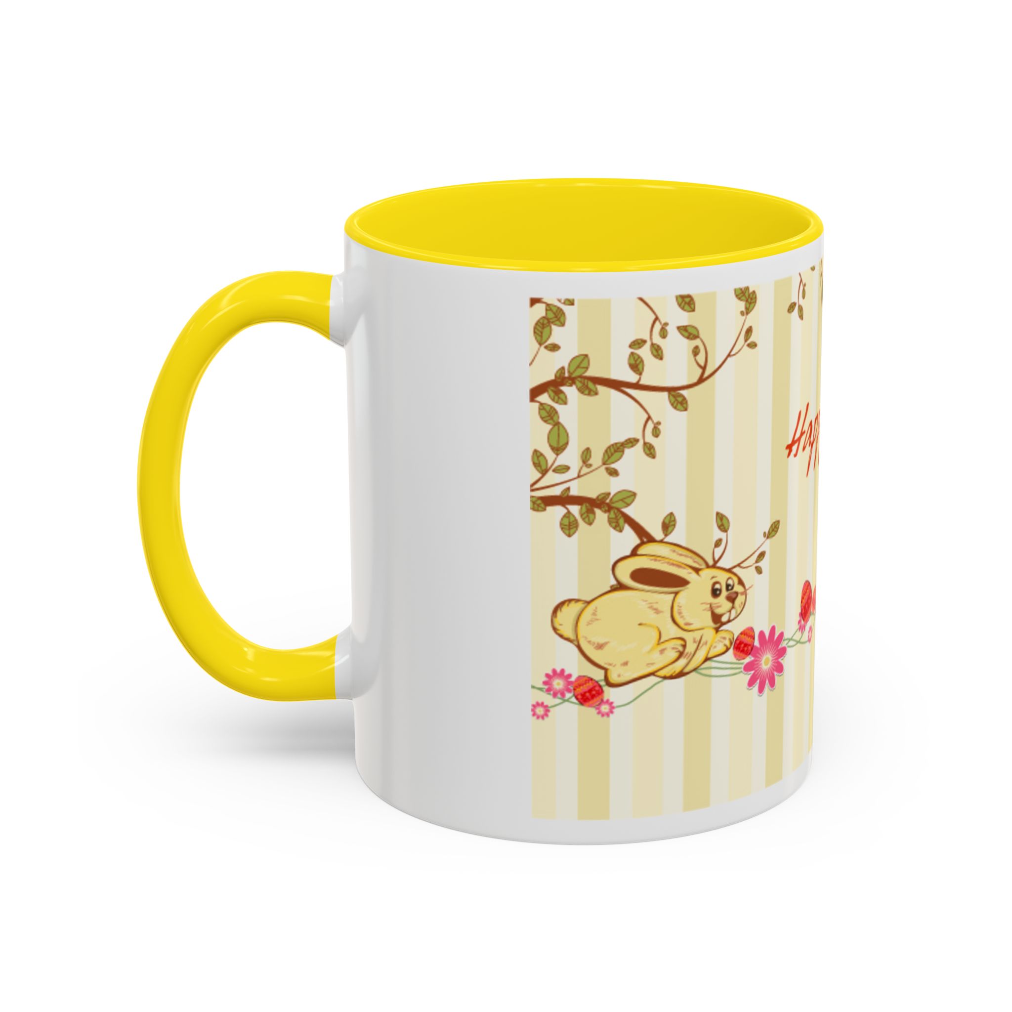 This ceramic mug brings a small, joyful scene to your mornings: a cheerful Easter bunny nudging a bright yellow chick, rendered in crisp, lively colors that pop against the glossy white surface.