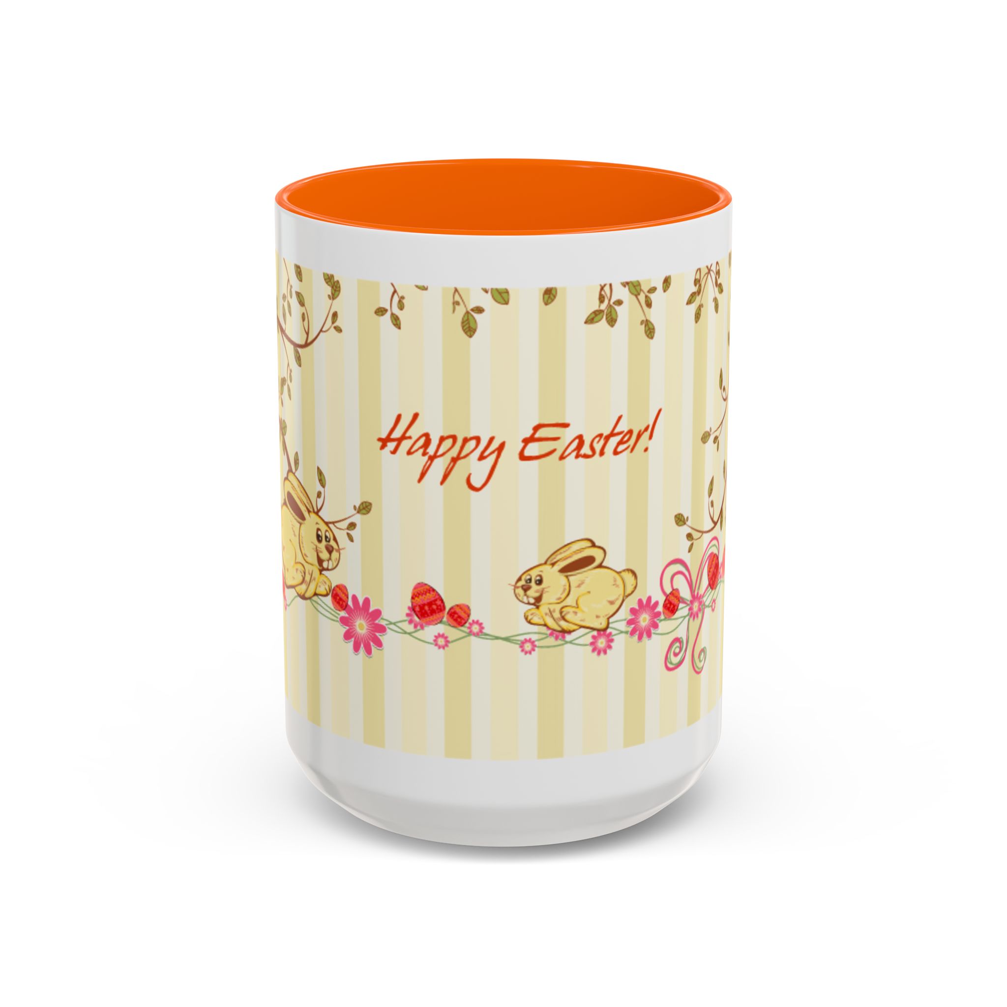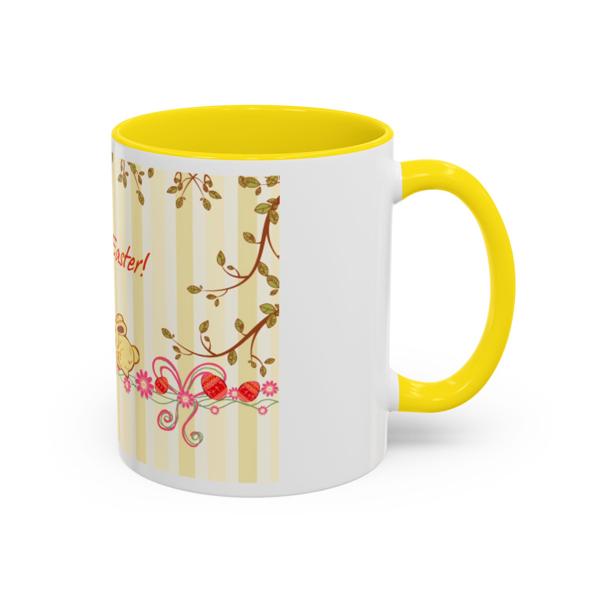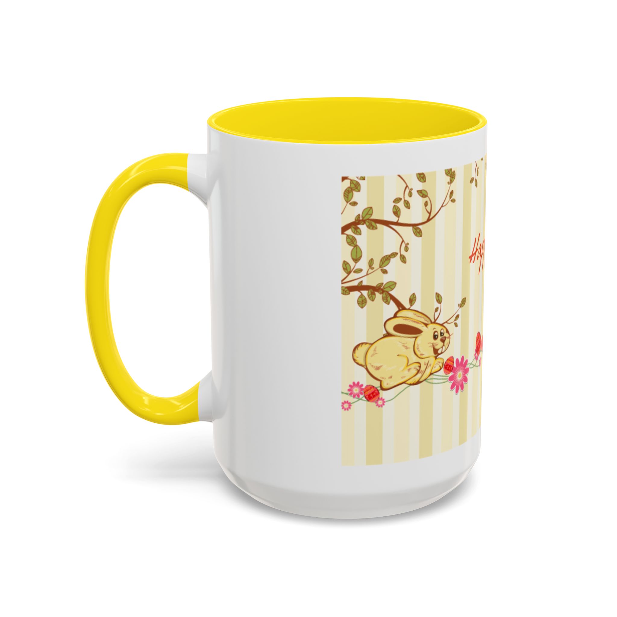 This ceramic mug brings a small, joyful scene to your mornings: a cheerful Easter bunny nudging a bright yellow chick, rendered in crisp, lively colors that pop against the glossy white surface.