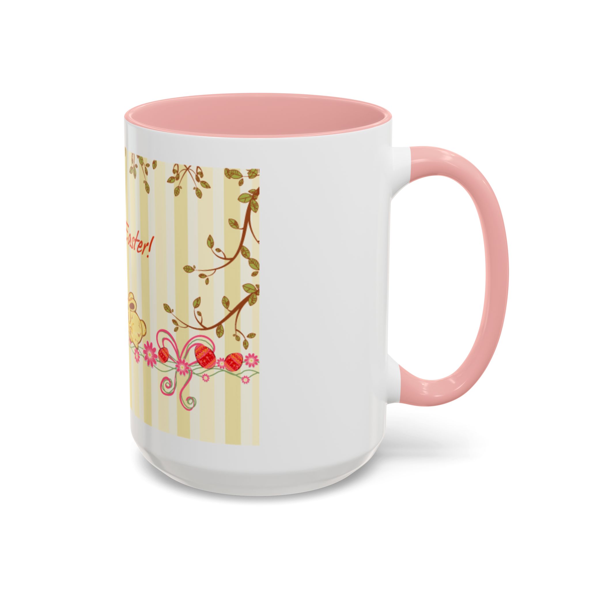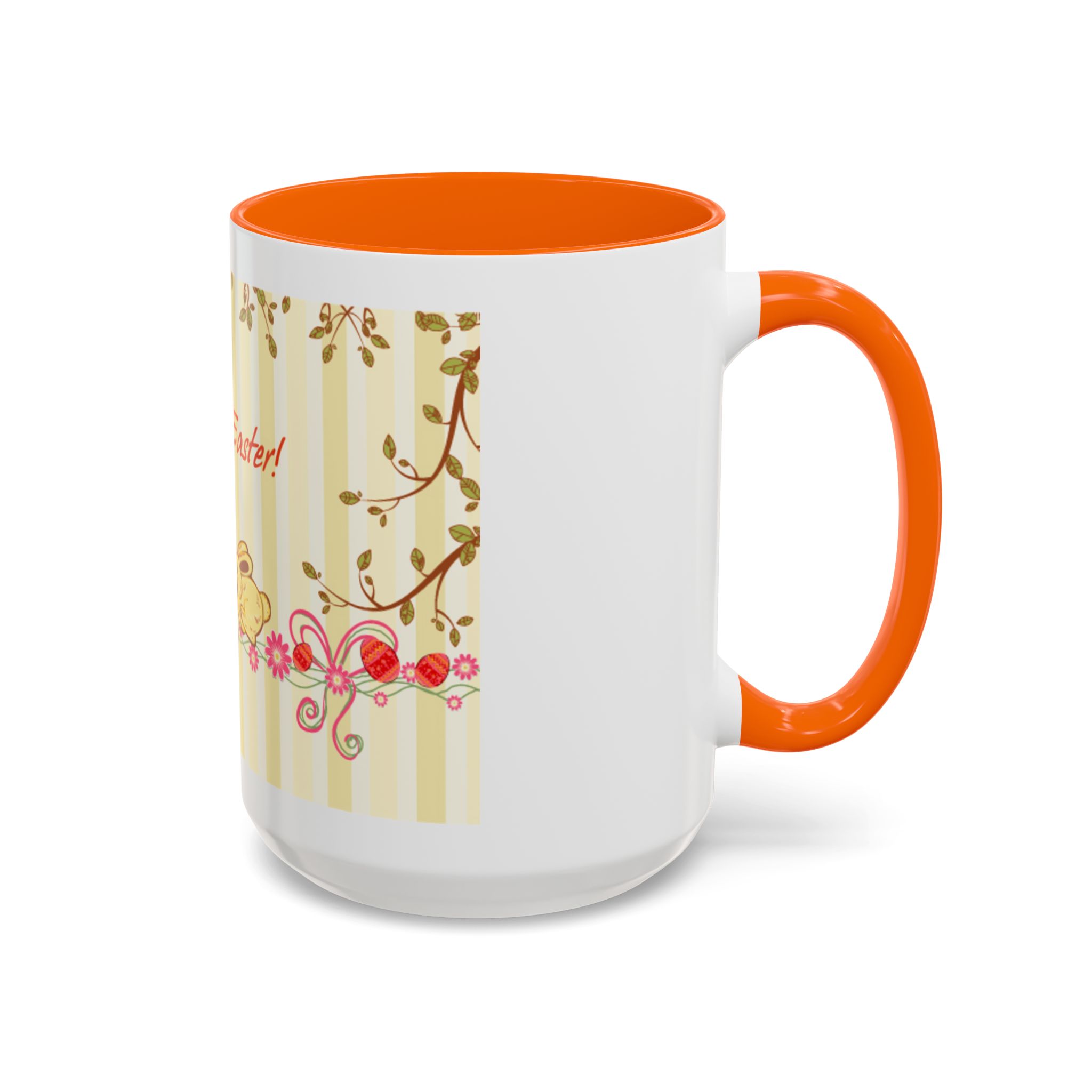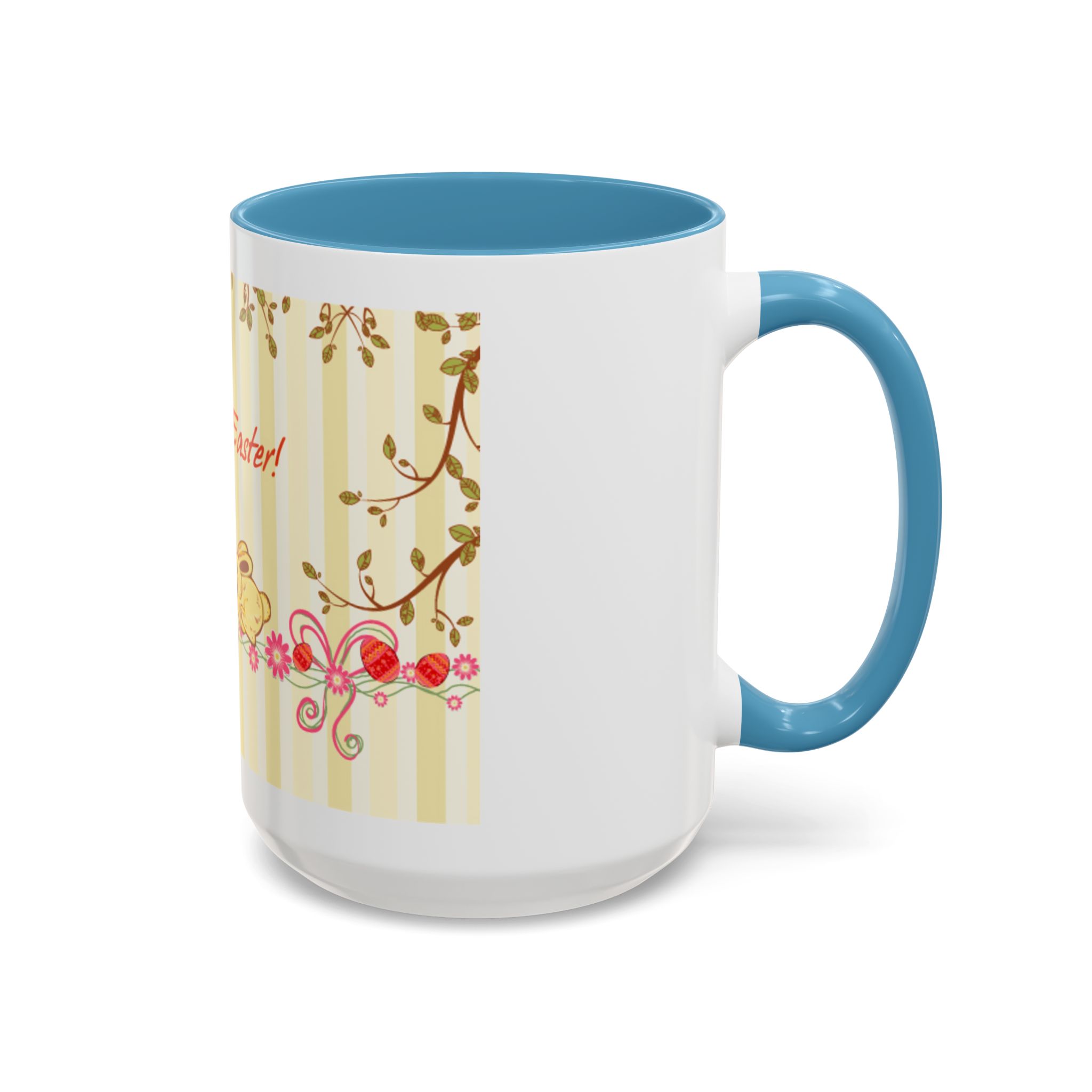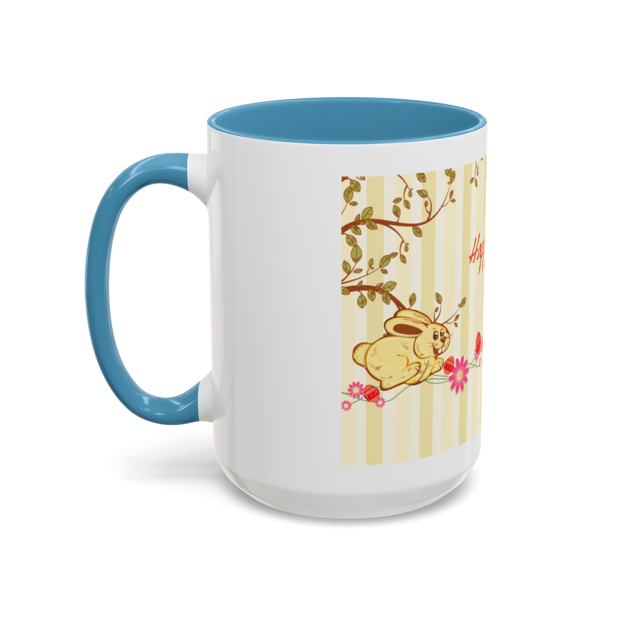 This ceramic mug brings a small, joyful scene to your mornings: a cheerful Easter bunny nudging a bright yellow chick, rendered in crisp, lively colors that pop against the glossy white surface.